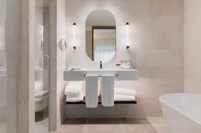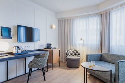 Incroyable ! La suite junior procure espace et confort. De son balcon complètement aménagé, elle profite d’une vue merveilleuse sur le port ou la cathédrale. Elle baigne dans une atmosphère sereine et relaxante. Très spacieuse, elle dispose d’un salon meublé d’un canapé et d’un bureau. Salle de bain chic.