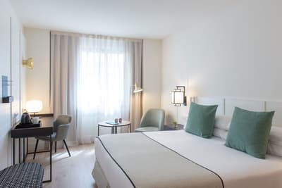 Agréable et très confortable, cette belle chambre est cosy et fonctionnelle. La fenêtre vitrée offre une belle vue sur le patio intérieur ou sur la rue. Un bureau et un fauteuil sont installés dans un coin de la pièce. Salle de bain chic.