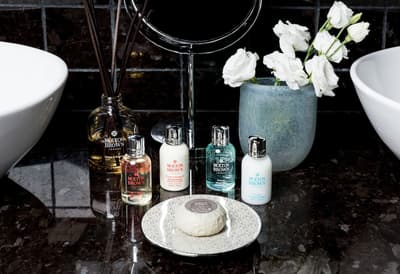 Télévision Loewe, Meubles de design, Articles de toilette Molton Brown, Peignoir, Pantoufles, Sèche-cheveux, Ordinateur IMAC, Machine à café Nespresso.