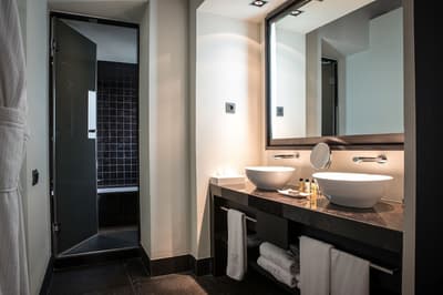 Télévision Loewe, Meubles de design, Articles de toilette Molton Brown, Peignoir, Pantoufles, Sèche-cheveux.