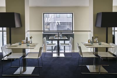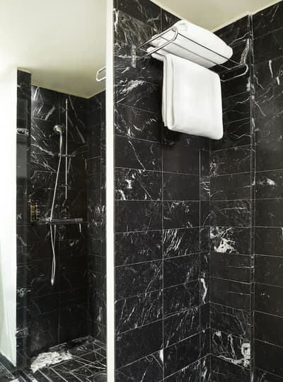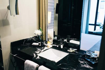 Très agréable, elle a tout le nécessaire pour un séjour confortable et reposant. La grande fenêtre vitrée offre une belle vue sur la cour intérieure. Elle accommode un lit King ou 2 lits simples. Salle de bain chic.