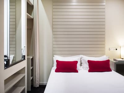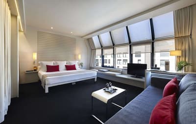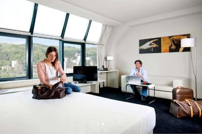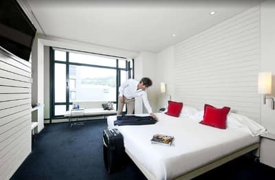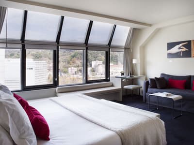 Conçue pour accueillir toute une famille, elle est plus spacieuse et procure plus de confort. Sa grande fenêtre vitrée profite d’une vue merveilleuse sur la ville et le Guggenheim. Elle dispose d’un canapé-lit dans le coin salon et peut accueillir un lit supplémentaire pour un enfant. Salle de bain chic.