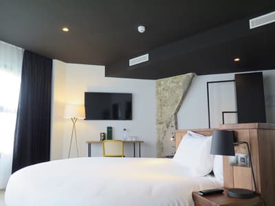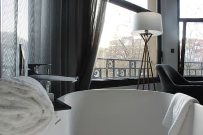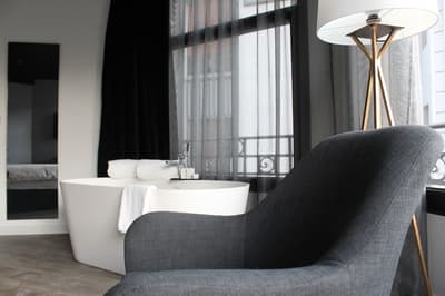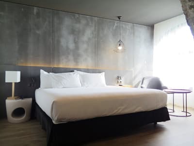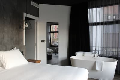 Waouh, quelle jolie façade jaune pastel ! Historique qui plus est, du moins, on en a l’impression. Et en effet, ce bel immeuble date de l’année 1924 ! En poussant sa porte, vous allez être surpris de trouver une déco au style industriel. Depuis la rénovation, effectuée avec brio, tout se mélange : murs de béton et de briques, poutres apparentes, plafond de tôle, vitraux… Ajoutez à cela un ascenseur de verre et des passerelles qui permettent d’admirer le tout — et aussi de mener aux chambres. À vous de faire la différence entre l’ancien et le nouveau ! On se croirait un peu dans un musée. Dans les logements, hyper confortables, le gris, le noir et le bois foncé dominent, sans que ça fasse trop sombre. Selon la catégorie, vous serez peut-être ravi d’avoir une baignoire comme pièce maîtresse, un vaste lit rond ou un petit balcon pour déguster votre café fumant le matin. Le petit déjeuner est servi par un Chef étoilé et le personnel est tout simplement génial. Vous serez accueilli comme un roi, que vous veniez seul ou avec votre toutou ! Votre compagnon à quatre pattes est en effet convié à dormir à vos côtés et à déguster des friandises tout au long du séjour. Plus qu’à emporter son doudou dans la valise et à faire une entorse à son régime.