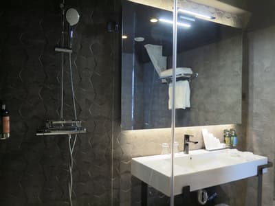 Très agréable, elle est confortable et sereine. Ses fenêtres offrent une belle vue sur le patio intérieur. Bien aménagée, elle procure une sensation d’espace. Elle accommode un grand lit et dispose d'un petit bureau. Salle de bain chic.