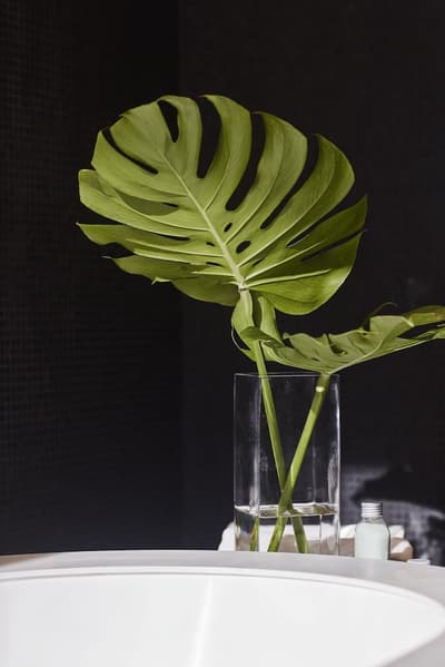 Plus spacieuse, elle procure encore plus de confort. Le grand panneau vitré profite d’une belle vue sur le patio intérieur. La douche aux parois vitrées est installée dans la pièce pour ne faire qu’un. Elle dispose d’un beau fauteuil dans un coin de la pièce. Salle de bain chic avec douche à effet de pluie.
