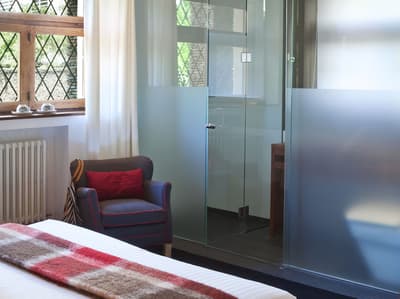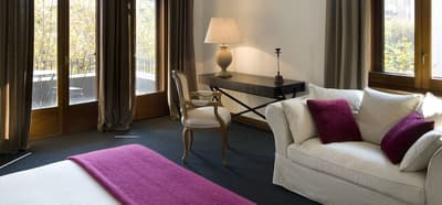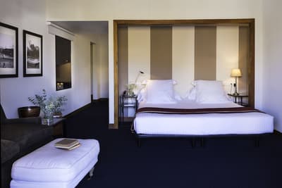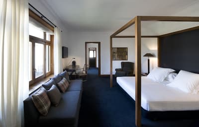 Cette belle suite profite d’espace et d’intimité. Elle est idéale pour les couples et baigne dans une atmosphère luxueuse et romantique. Les grandes fenêtres vitrées profitent d’une vue reposante. Coin salon meublé d’un canapé-lit et de fauteuils. Salle de bain chic avec douche.