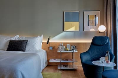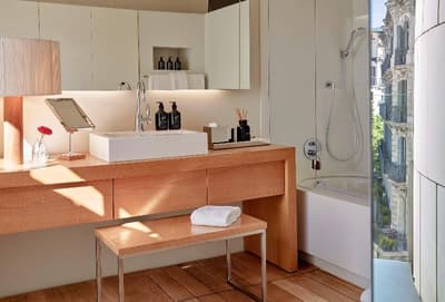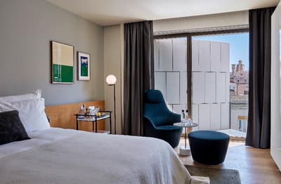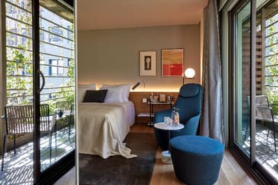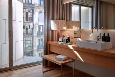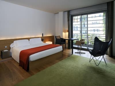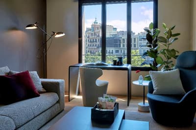 Plus spacieuse, elle procure encore plus de confort. La porte-fenêtre profite d’une belle vue sur la ville de Barcelone ou sur les jardins intérieurs. Elle accueille un grand lit et un coin salon meublé d’un fauteuil. Salle de bain chic.