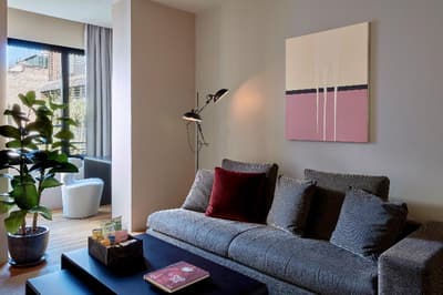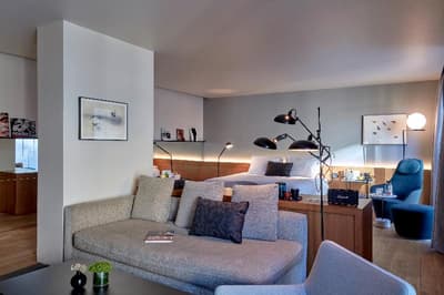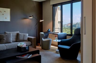 Elle est très spacieuse et profite d’espace et de confort. C’est le top, ses grands panneaux vitrés profitent d’une vue merveilleuse sur la ville ou sur les jardins intérieurs. Elle dispose d'un coin lecture, d’un petit salon meublé de fauteuils confortables. Salle de bain chic avec une baignoire.