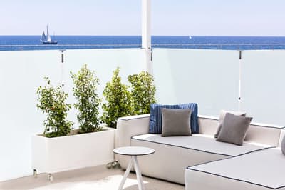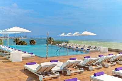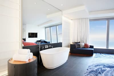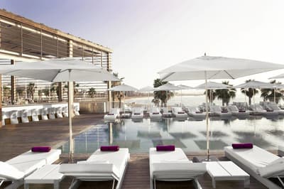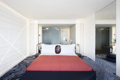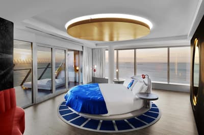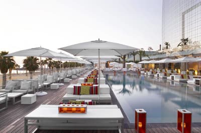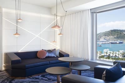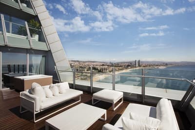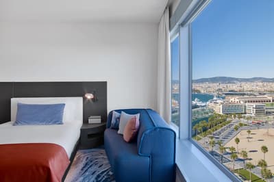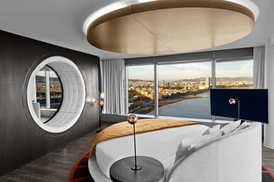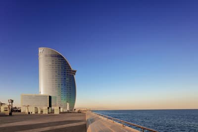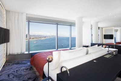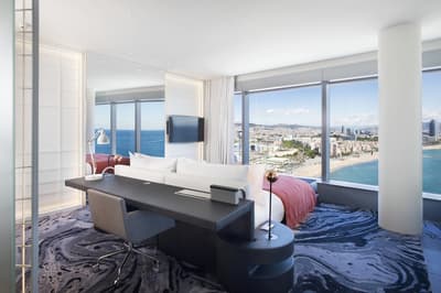 Vous l’avez forcément déjà vu si vous êtes allé faire un tour à la plage de Barcelone ! Et même si ce n’est pas le cas, vous avez dû apercevoir le W Barcelona sur les photos de vos amis ! Comment ça, vous ne connaissez personne qui est allé à Barcelone ? C’est louche... Tout simplement parce que le W Barcelona, c’est ce fameux building en verre immense en forme de voile, avec autant d’étages qu’il y a de lettres dans l’alphabet. Ça y est ? OK. Alors voilà, après l’avoir entraperçu ou observé pendant toutes ces années, vous allez maintenant dormir dedans, et le plus haut possible ! Qui l’eut cru ? La vie est pleine de surprises, décidément ! Vous vous en doutez bien : si le bâtiment est visible depuis tout Barcelone, la vue depuis là-haut est forcément à couper le souffle. Attention, les photos ne reflètent absolument pas la réalité du truc, il faut se trouver à l'intérieur pour ressentir les sensations que ça procure. A celles et ceux qui ont le vertige, vaudrait peut-être mieux ne pas trop s’approcher des vitres, d’accord ? Encore moins de celles du bar panoramique du 26e étage… Et même si vous aurez droit à cette vue du matin au soir (entre la piscine à débordement face à la mer et les lits face aux fenêtres dans les chambres, les occasions ne manquent pas !), sachez que vous ne vous en lasserez absolument jamais !
