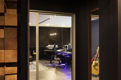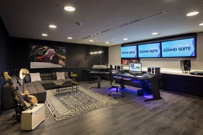 Dominée de blanc, elle est très design. La pièce est vivante et haute en couleur avec du bleu et du rouge. Les meubles aux lignes contemporaines donnent un style moderne à l’ensemble. Les belles lampes et les touches de métal la rendent élégante.