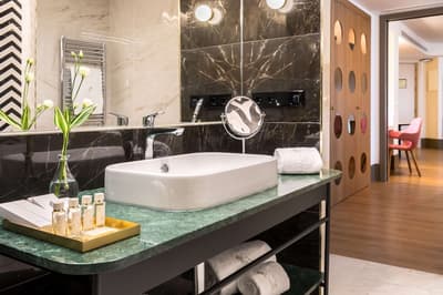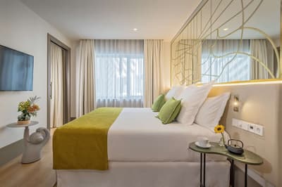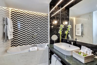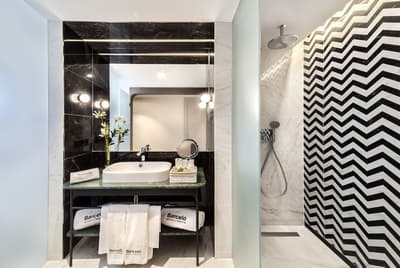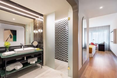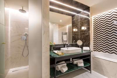 Cette belle chambre profite de calme et de sérénité. La grande fenêtre offre une vue merveilleuse sur la ville vibrante. Elle accommode un lit King ou 2 lits simples et dispose d’un fauteuil et d’un bureau dans un coin de la pièce. Salle de bain avec douche à effet de pluie.