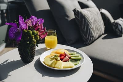 Encore plus spacieuse, elle profite de plus de confort. Les grands panneaux vitrés profitent d’une belle vue. Coin salon meublé de fauteuils pour se relaxer. Salle de bain chic avec douche à effet de pluie.