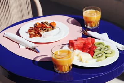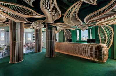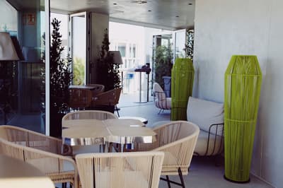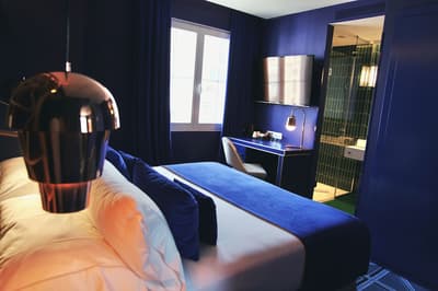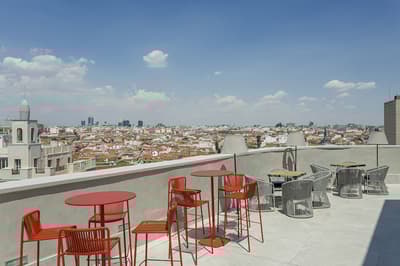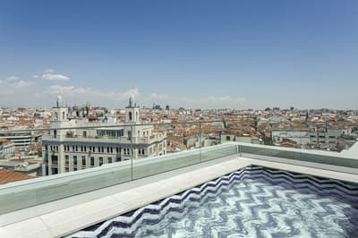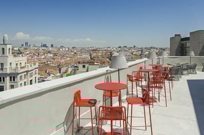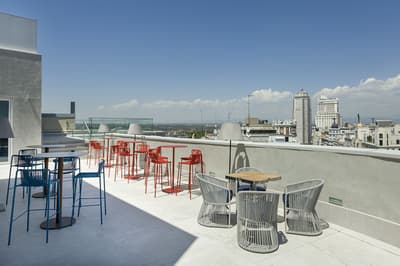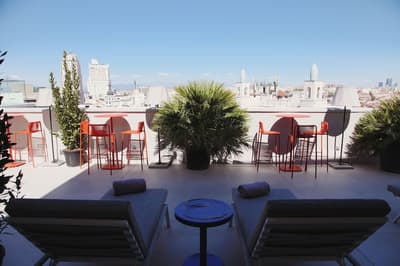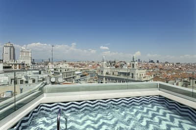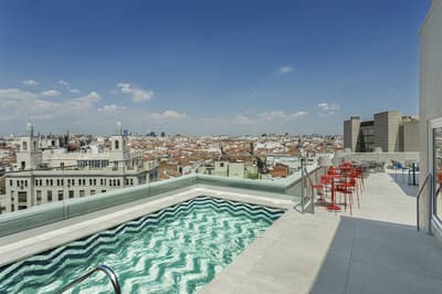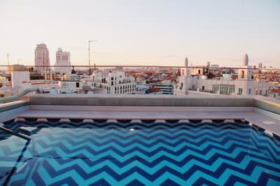 3,2,1, décollage immédiat pour la planète Macarena ! Pour son adresse de la Gran Vía, Room Mate se lâche et nous emmène loin. Le design de Room Mate Macarena est exceptionnel : il s’inspire de la nature et de l’artisanat pour un résultat complétement futuriste ! L’influence orientale est aussi très présente, vous allez la retrouver un peu partout. La réception est particulièrement épatante avec ses colonnes et son plafond recouvert d’immenses feuilles sculptées dorées. On dirait qu’elles sont en mouvement tant leurs lignes ondulent avec grâce. Il faut dire que la moquette et les murs vert sapin les mettent parfaitement en valeur. Jetez un œil à la salle du petit-déjeuner, son jeu de lumière vous appelle. Les piliers blancs sont cerclés de miroirs qui reflètent un carrelage hexagonal jaune, bleu et noir, c’est à en perdre ses repères ! Là encore, le végétal s’invite. Les cloisons ont des allures d’arbres, les tables ont des formes de fleur et les sièges ont une peau de pêche ! Et au fait vous savez quoi ? L’hôtel a aussi un rooftop !! Vous aurez la sensation d’être sur le pont d’un paquebot depuis ses terrasses à la vue panoramique. On espère que vous n’avez pas le mal de mer. Si vous avez de besoin de vous passer un peu d’eau sur le visage pour reprendre vos esprits, la petite piscine aux lignes graphiques fera parfaitement l’affaire, qu’en dites-vous ?