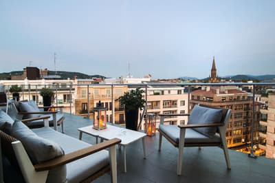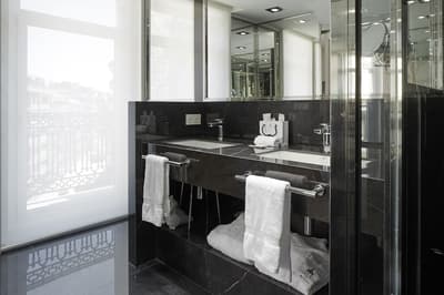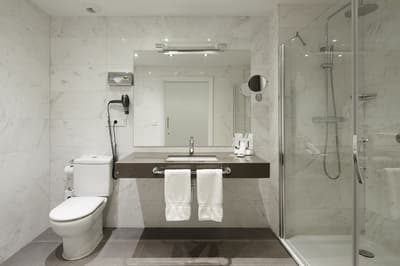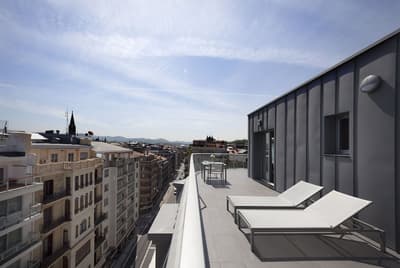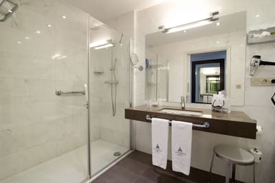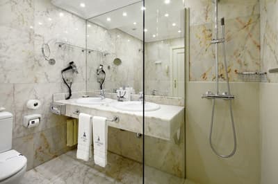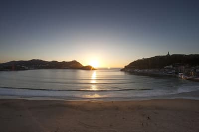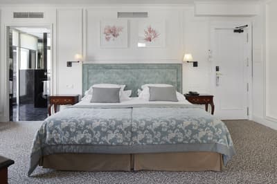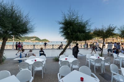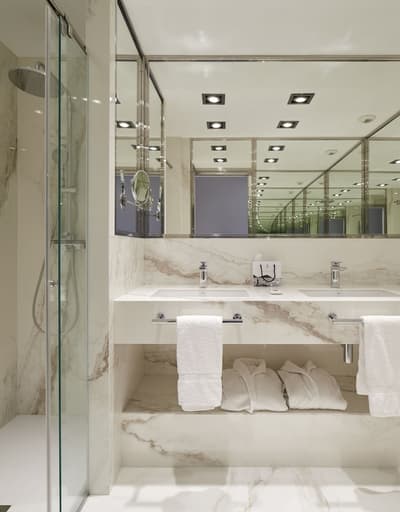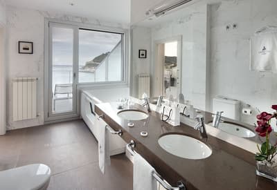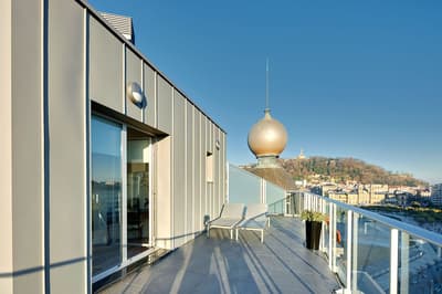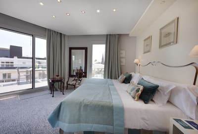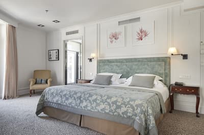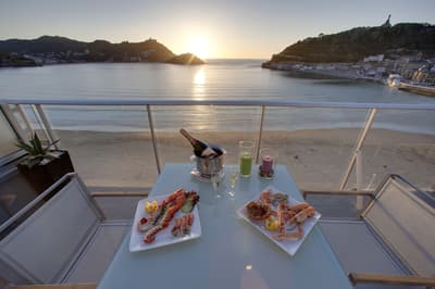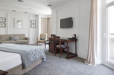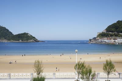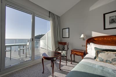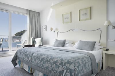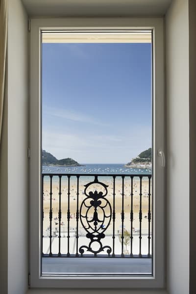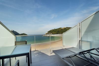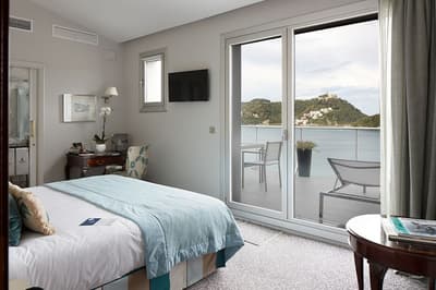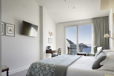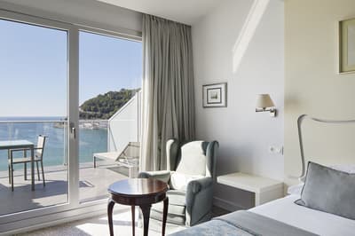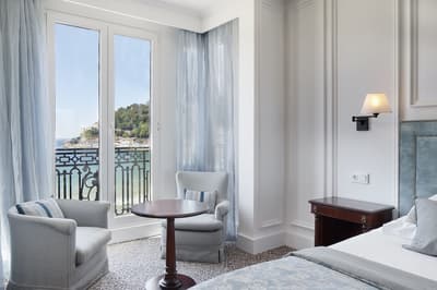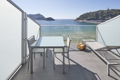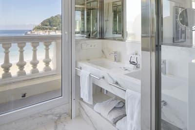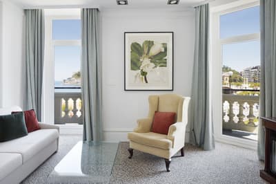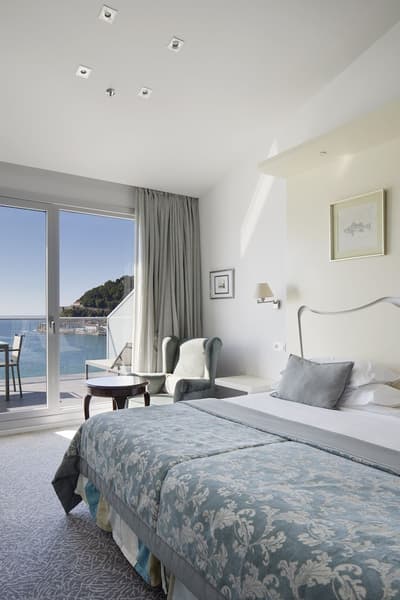 Elle profite d’une vue exceptionnelle sur la baie de la Concha et la promenade. Un petit salon meublé de fauteuils confortable est installé dans un coin de la pièce. C’est l’idéal pour un séjour reposant et serein. Salle de bain chic.