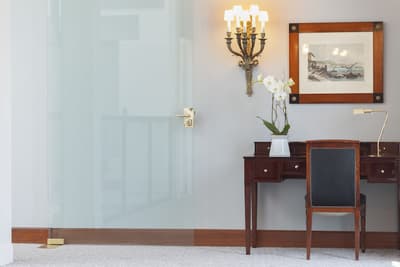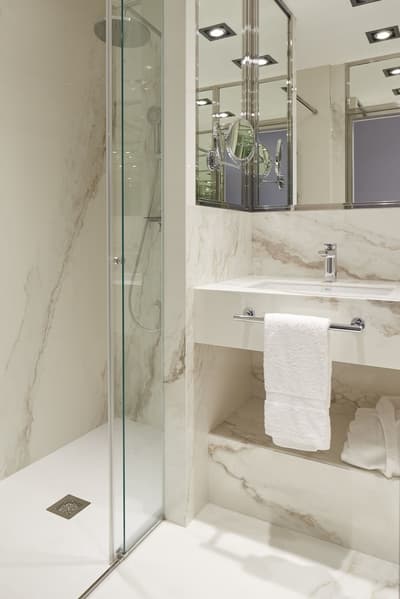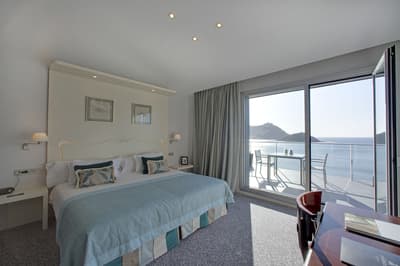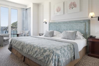Cette petite chambre profite d’un cadre merveilleux. Un petit salon meublé de fauteuils confortable est installé dans un coin de la pièce. Sa grande baie vitrée lui offre une vue merveilleuse sur la promenade et sur l’océan. Salle de bain chic.