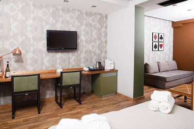 Climatisation, Réveil Articles de bain, Peignoirs et chaussons, Télévision câble-satellite, Chauffage central, Placard, Café Service de ménage quotidien, Téléphone avec ligne directe, Serrures électroniques, Télévision à écran plat, Miroir pleine longueur, Blanchisserie pour les invités Sèche- cheveux, Accès Internet haut débit à contrôle individuel Climatisation, Fer et planche à repasser, Minibar, Ameublement moderne, Chaînes cinéma, Musique, Chambres non-fumeurs disponibles, Réfrigérateur, Service en chambre (jusqu'à minuit), Coffre- fort, Coin salon, Chaussons, Canapé-lit, Insonorisation Fenêtres, Télévision, Réveil, Boisson de bienvenue, Accès Internet Wi-Fi (gratuit), Bureau.