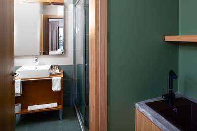 Le décor est moderne avec un parquet, un mobilier en bois clair et l’ensemble se complète dans des couleurs chaudes et des lignes simples. La chambre est dotée d’un grand lit double ou 2 lits simples et la salle de bains est équipée d’une douche. Ambiance détendue !