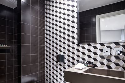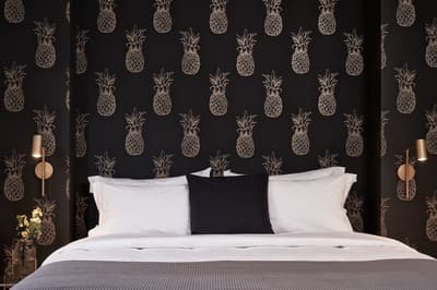 Teintes au choix géométrique ou exotique (ananas) selon les chambres. Salle de bain géométrique noir et blanc.