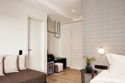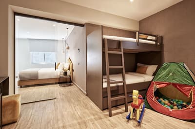 Suite idéale pour les familles avec enfants, elle possède un grand lit double dans la chambre parentale et un lit superposé dans la chambre des enfants, séparées par une porte vitrée. Il y a du parquet en bois clair dans toute la suite. Vue sur la ville.