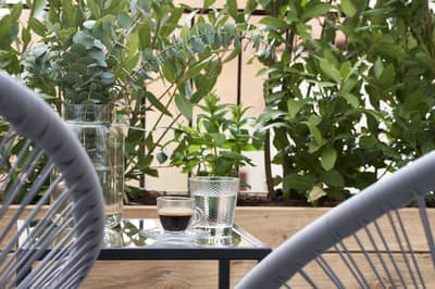 Le summum du luxe, dans un loft pas très spacieux mais hyper VIP : un jacuzzi avec vue sur Athènes à travers la fenêtre et une belle terrasse privée, entourée de verdure et avec du mobilier extérieur. Le comble du romantique !