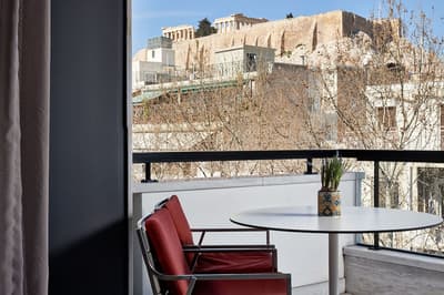 Cette luxueuse chambre dispose d’un balcon meublé qui donne sur les magnifiques platanes de la rue Dionysiou Areopagitou et est suffisamment spacieux pour organiser un dîner privé en plein air.