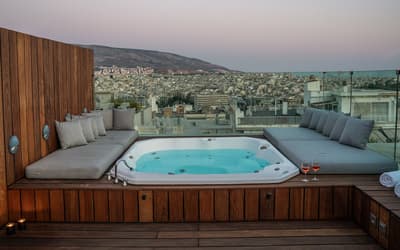 Répartie sur deux niveaux, elle dispose d’un grand balcon qui s'étend sur toute la longueur de la suite, avec des sièges pour prendre des bains de soleil, rêvasser ou observer les étoiles, selon l'heure de la journée. Avec un superbe jacuzzi privé, entouré d'un pont en teck, vous serez émerveillés par les vues époustouflantes sur l'Acropole qui semble sortir du pont.
