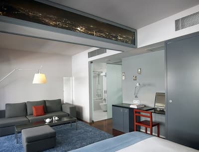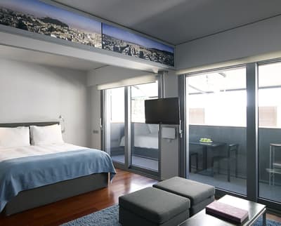 La décoration est luxueuse et contemporaine avec un beau parquet, des images panoramiques d'Athènes de jour comme de nuit, prises depuis les points les plus élevés de la ville et imprimées sur des caissons lumineux en plexiglas. La chambre insonorisée est dotée d’un grand lit douillet. Ambiance cosy et détendue !