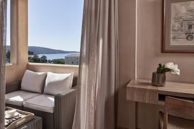 Spacieuse, le décor est dans un style méditerranéen chic avec des tons de terre apaisants et des meubles artisanaux. La chambre est dotée d’un lit king avec des draps en coton moelleux et d'un lit d’appoint pour une troisième personne. La salle de bains moderne et élégante est équipée des produits de bien-être homéopathiques Korres. Le tout dans une atmosphère chaleureuse et accueillante !