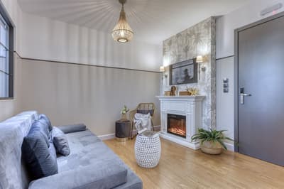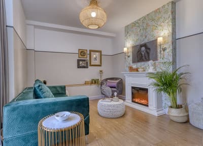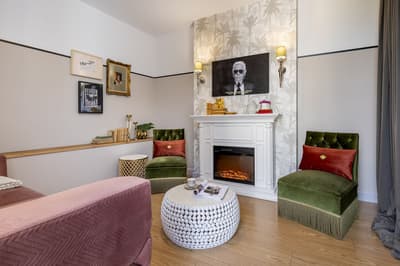 La décoration est soignée et arbore un style contemporain avec un beau parquet, un mobilier élégant, des luminaires design et se complète dans du papier peint et des œuvres d’art murales. La chambre est dotée d’un lit king et un canapé-lit double est joliment disposé dans le salon face à la cheminée décorative. Vous pourrez vous détendre sous la douche hydromassante à l'italienne dans la salle de bains en marbre. Ambiance conviviale et cosy !