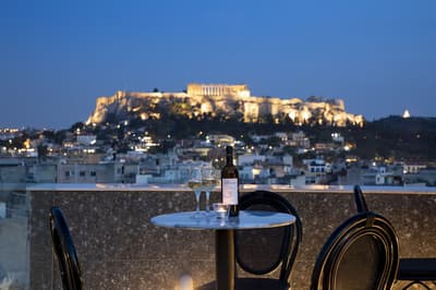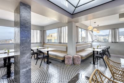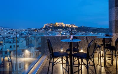 Une adresse moderne et singulière installée en plein cœur de la ville, avec une déco soignée et une vue juste incroyable sur Athènes.