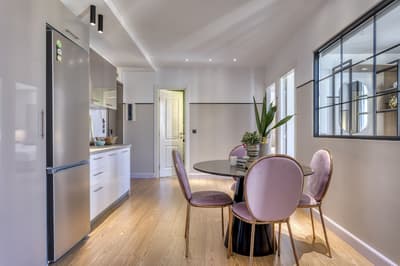La décoration est soignée et arbore un style contemporain avec un beau parquet, un mobilier élégant, des luminaires design et se complète dans du papier peint et des œuvres d’art murales. La chambre est dotée d’un lit king et un canapé-lit double est joliment disposé dans le salon face à la cheminée décorative. Vous pourrez vous détendre sous la douche hydromassante à l'italienne dans l’une des deux salles de bains en marbre. Ambiance conviviale et cosy !