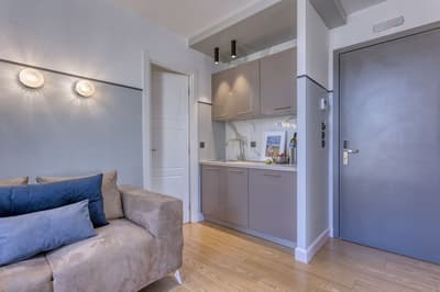 La décoration est soignée et arbore un style contemporain avec un beau parquet, un mobilier pratique, des luminaires design et se complète dans du papier peint et des cerceaux muraux. La chambre est dotée d’un lit king et vous pourrez vous détendre sous la douche hydromassante à l'italienne dans la salle de bains en marbre. Ambiance conviviale et cosy !