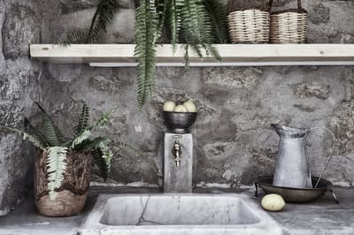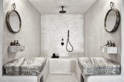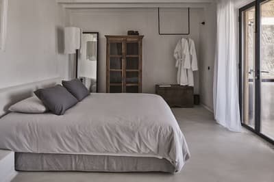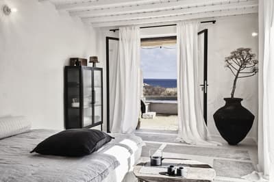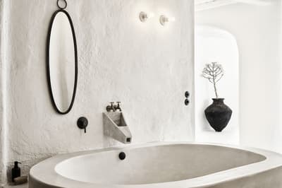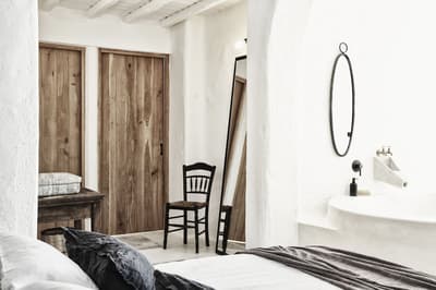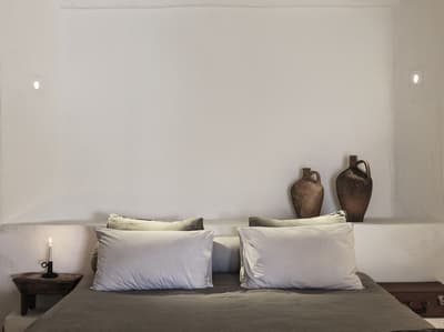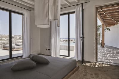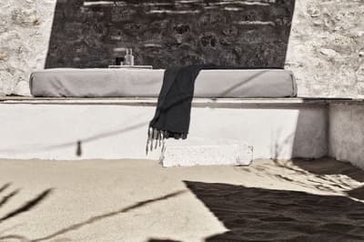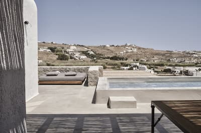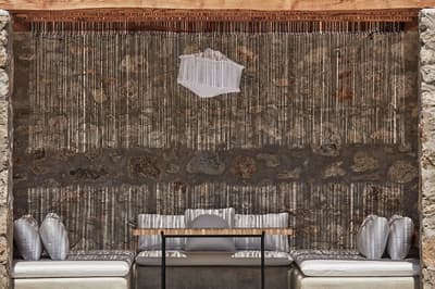 Le Nomad Mykonos est un véritable sanctuaire, une ode aux Cyclades, à la nature, à la pureté. Placée au cœur de ce petit temple de la sérénité, la piscine bouscule tous les codes esthétiques traditionnels. La pierre locale grise donne l'impression d'un bassin creusé à même la roche. Les marches vous y invitent latéralement et des banquettes courent tout autour pour vous permettre de vous allonger dans l'eau... la définition même d'un bain de soleil ! Des jacuzzis et piscines privées campent aussi sur les terrasses des suites mais pas que ! Certaines sont à cheval sur l'intérieur et l'extérieur, dingue ! Préférez la vue mer, car le coucher de soleil depuis ce spot (ou encore depuis votre daybed) sera d'autant plus délicieux. On adore la déco, minimaliste avec juste ce qu'il faut, des paniers, des amphores, de vieilles chaises tressées, des luminaires en toile, des miroirs cerclés d'un anneau en argent poli. En soirée, la cheminée extérieure est le point de convergence de tous ceux qui aiment échanger autour d'un verre...