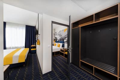 Vous vous souvenez des « Cool, cool, cool » d’Abed dans Community ? Si oui, il en aurait sûrement lâché un dans cet hôtel. Si non, vous devez absolument rattraper cette série mais vous aurez compris que cool est l’adjectif pour décrire cet hôtel. Hashtags et néons lumineux compris, forcément. Les chambres vont à l’essentiel, elles sont même assez petites mais vous êtes là pour dormir, commencez pas à faire les difficiles. De la moto perchée à toute la déco digne de petites boutiques, le design contemporain vous plaira forcément. Et même si ça fait très jeune et moderne, tout le monde y trouvera son compte. Attention, par contre, il faut qu’on vous parle d’un truc… le jaune. Sérieux, le mystère de la chambre jaune, c’est là ?! Il est carrément omniprésent : sur la façade atypique, dans les parties communes et en masse dans les chambres, où il est toutefois contrebalancé par des touches de bleu marine, comme la tête de lit en jean. Et c’est là que tout prend sens, comme dans les turning points de films policiers, on se croirait en fait sur un bateau ! Mais oui, le ciré jaune fluo du marin et la marinière bretonne. Allez, your date with Budapest vous attend. Et ça, c’est pas nous qui le disons, c’est ce qui est écrit à l’entrée du D8. A l’abordage !