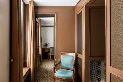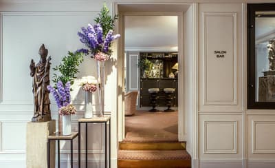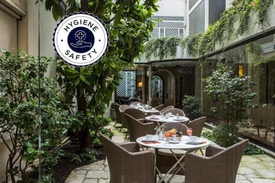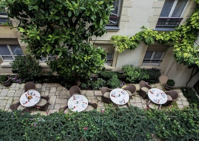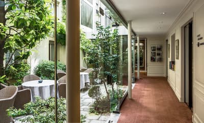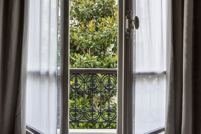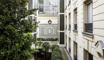 Quand on est architecte, qui plus est du jeune roi Louis XIV, il est logique de bâtir soi-même sa demeure. C’est ce que fit en 1658 le sieur Daniel Gittard, en cette super chic rue des Saints-Pères, tout près du boulevard Saint-Germain. Ce quartier, toujours aussi tendance aujourd’hui, s’est d’ailleurs développé pile à l’époque. L’habile professionnel fit également de son hôtel particulier un immeuble de rapport. Et c’est à son locataire du premier étage qu’on doit le plus bel ornement des lieux : un plafond intact, peint d’une fresque de 40 m². Les trois personnages représentent le bon Augure (une sorte de devin) couronné par la Vertu, sous le regard de l’Intelligence (grimée en chérubin) — un peu dur à placer mais de quoi faire son effet en soirée ! Chaque soir, un couple de chanceux peut s’en repaître à volonté avant de s’endormir… Les autres chambres sont également bien pourvues en œuvres d’art classiques, certes moins spectaculaires, et en mobilier de caractère. La plupart donnent sur l'agréable cour-jardin qui se prête aux p'tits déj' estivaux. Et par mauvais temps, le salon mouluré vous offre un magnifique lot de consolation. Décidément, ce boutique-hôtel Grand Siècle, apprécié par Juliette Greco et Francis Bacon, cache bien son jeu — y compris de forts engagements écolo !
