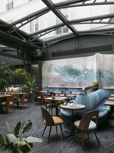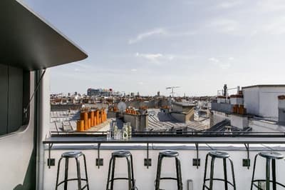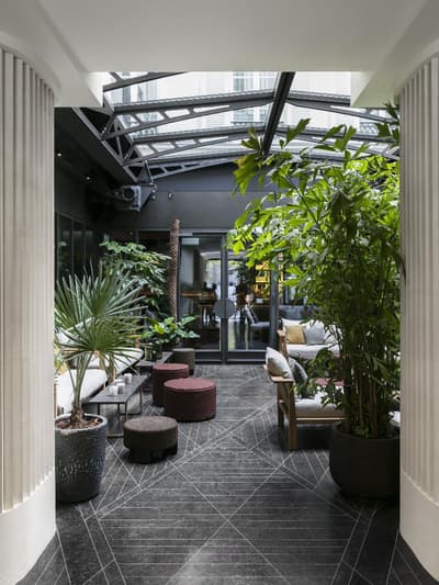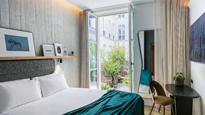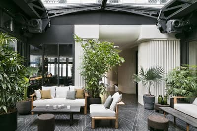 Un rooftop à Paris, c’est carrément le pied ! Celui-ci n’a qu’une trentaine de places, donc attendez-vous à faire un peu la queue. Mais vous aurez votre selfie de la semaine. Avec à la main un verre de Yellow rose (vermouth, liqueur de rose, pamplemousse) et derrière vous les toits, l’église, les tubes enchevêtrés du Centre Pompidou ou le dôme du Sacré-Cœur. Et on ne vous parle pas du sunset ! Hors saison, vous vous assoirez à l’Herbarium, le bar à cocktails du rez-de-chaussée. Salle ou comptoir, le cadre est aussi sympa que les subtils mélanges, et l’ambiance assurée jusque tard. Juste à côté, goûtez aux spécialités italiennes du Ristorante Nationale, à l’intérieur ou dans le patio ! Sa double verrière s’ouvre en silence et se ferme dès les premières gouttes. Cette innovation technologique se veut un clin d’œil au Conservatoire national des Arts et Métiers, en face. Et le choix d’un artisanat de qualité a également guidé l’aménagement des 66 chambres, très modulables. Celles-ci occupent deux anciens immeubles haussmanniens désormais reliés. Ni papier, ni peinture mais de belles matières brutes les habillent comme le bois massif, le granit, le béton banché, le terrazzo et l'acier. C’est plus naturel et ça vient appuyer les engagements écolo de l’hôtel.