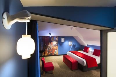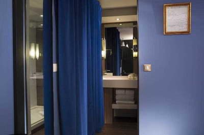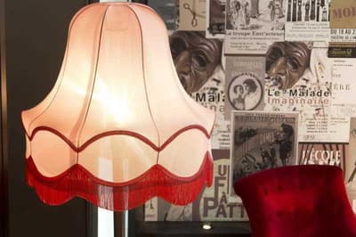 Gymnase, Antoine, Petit Saint-Martin, Renaissance... le quartier des Grands Boulevards est réputé depuis des décennies pour toutes ses salles de spectacles. Alors quoi de plus logique que de consacrer un hôtel au théâtre, histoire qu’une fois le rideau baissé, la pièce continue jusque dans votre chambre ? Ici, vous aurez le choix entre les univers de trois grands auteurs classiques français. Si on vous dit Le Bourgeois Gentilhomme, La Dame de chez Maxim et La Belle et la bête, vous voyez ? Molière c’est facile, Georges Feydeau et Jean Cocteau un peu plus touchy. Pas de panique, vous allez réviser tout ça : dans chaque chambre, vous aurez des citations et de grands visuels. Des accessoires leur sont liés : téléphone rétro, abat-jour en dentelle noire, lourds tissus en velours, fines chaises ou encore poufs au rouge claquant. Même la réception se terre dans une petite loge capitonnée et cramoisie. Et dans les couloirs et les parties communes, vous zyeuterez affiches, programmes et lithographies. Le décor se poursuit dans l’espace cosy de l’honesty bar, où vous pourrez vous servir un bon verre de vin ou composer votre propre cocktail. Seul le hammam en accès gratuit, dans son costume de carreaux noirs et son plafond étoilé, est dépourvu de référence théâtrale !