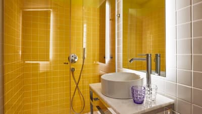 « Mama loves you » : elle vous l’a même écrit sur le miroir (avouons-le, étonnamment gigantesque) de votre chambre. A partir de là, vous en déduisez ce que vous voulez ! En tout cas, Mama aime parler d’elle à la troisième personne, mais ce que Mama aime plus que tout, c’est entendre ses invités s’amuser. Pour cela, vous trouverez une salle d’arcade au premier étage. A l’intérieur ? Des flippers Stranger Things, Les Gardiens de la Galaxie et Star Wars qui raviront les plus geeks d’entre vous, et un baby-foot pour 8 à 10 personnes qui promet des parties endiablées et dangereuses pour les amitiés. Le bar diffuse quant à lui les matchs de foot, quand un DJ-set n’est pas prévu jusqu’à pas d’heure. Or quiconque a déjà mis les pieds dans un hôtel du groupe sait à quel point les rooftops leur sont chers. Pour se donner des airs urbains, ce troisième Mama Shelter parisien s’est implanté près de La Défense. Depuis le rooftop ensoleillé, rempli de couleurs pastel et de fauteuils en rotin, à vous la vue sur les tours de verre. Dommage qu’il n’y ait pas vue sur la Tour Eiffel… AH SI ! La voilà, tout au fond ! La pollution nous l’aurait presque volée.