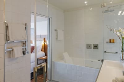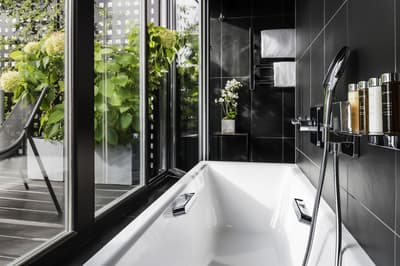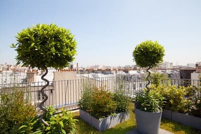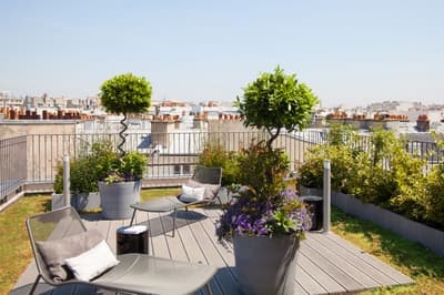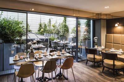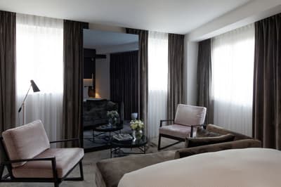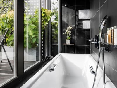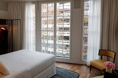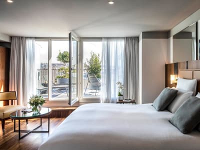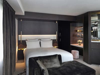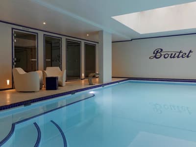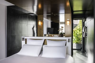 Le ton est donné dès les mosaïques de la façade vitrée de style art déco. Entre la frise florale et la marquise, quelques mots claquent sur fond or : "sciage", "panneaux contreplaqués", "placage", "ponçage", "tranchage", «"bois exotiques", "bois de pays" et, bien sûr, "Boutet". Avant d’être un des fleurons parisiens du groupe Accor, l’hôtel a été une chocolaterie suisse (de 1944 à 1983) et encore avant un importateur de bois pour les ébénistes et menuisiers qui bossaient dans le quartier. Ici, vous êtes près de Bastille, à deux pas du Faubourg Saint-Antoine, désormais plus branché commerces et restos qu’artisanat. L’établissement garde la marque de son histoire. Outre la façade restaurée, l’acier et le béton structurent les espaces intérieurs avec quelques carreaux et touches industrielles. Pour le reste, don’t worry, vous êtes bien dans un univers 5* de luxe et de confort. Bois précieux, cuir et velours beige ou gris recouvrent les espaces privés comme publics, en particulier le bar qui sert une restauration légère. Quelques terrasses arborées offrent aux suites deluxe de magnifiques vues sur les toits. Le mot Boutet signifie désormais davantage détente que travail. Il orne ainsi le carrelage blanc de la piscine, prélude à un Spa Codage des mieux équipés.