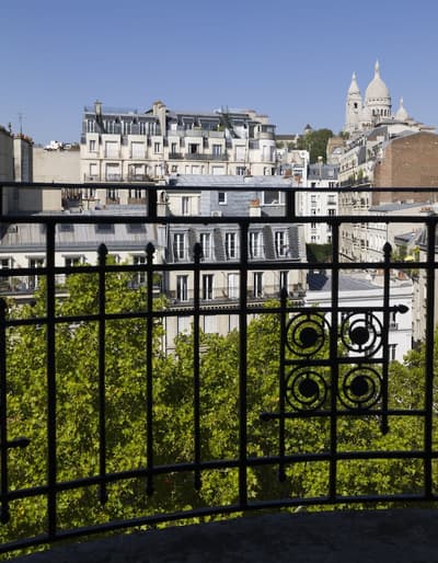 Les hôtels concurrents du quartier Montmartre-Pigalle doivent détester le Rochechouart tellement il cumule tout ! De la chrysalide est sorti un sublime papillon Art Déco après la complète rénovation achevée en 2020. Rien que la façade sur le boulevard est super chouette, avec les grandes baies du resto, habillées de bordeaux et ornées de motifs floraux dorés. L’hôtel date des années 1920, et il a fallu un talentueux duo de décorateurs pour lui redonner son clinquant. Le résultat est juste spectaculaire dans la grande salle de la brasserie, avec la mosaïque de cercles bleus et bruns au sol et l’enfilade d’arches blanches ornementées. D’autant que vous y mangez une goûteuse cuisine mi-canaille mi-bourgeoise, entre volaille truffée et délicieux gâteau de crêpes. Le service est aux petits oignons, comme dans tout l’hôtel. Les chambres, impeccablement insonorisées, restent dans cet esprit rétro, boisé et chaleureux, chic et trendy. N’hésitez pas à monter dans les catégories et donc dans les étages ! Avec ou sans balcon, la surprise émerge des hauteurs : une vue à tomber sur le Sacré-Cœur ! La récompense finale se trouve au 9e (ciel ou étage) avec un rooftop d’exception, pour boire un verre ou simplement instagrammer un panorama oufissime à 360 degrés.