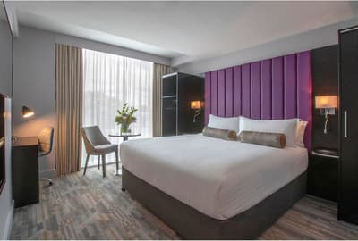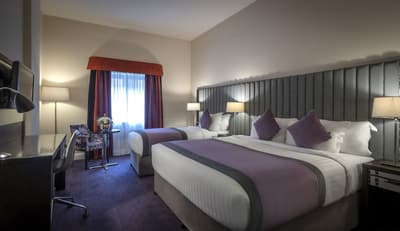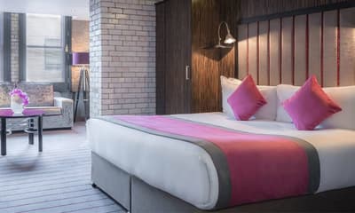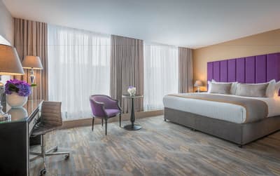 Vous allez voyager dans le temps à l’intérieur de cet énorme hôtel dublinois de 262 chambres ! Embarquement immédiat avec sa façade de briques rouges qui s’illumine en rose pendant la nuit ! Au Trinity City Hotel, on vous tiendra la porte pour entrer dans un univers foisonnant ! Luminaires suspendus en laiton, statues de bronze, larges miroirs ronds, boiseries grises et papiers peints fleuri bleu, l’établissement semble avoir été figé dans l’époque art déco. Et on adore ! Vous allez apprécier chiller dans les fauteuils Voltaire tout droit sortis de l’imaginaire d’Alice au pays des merveilles. Ou simplement vous asseoir à l’une des tables du jardin intérieur avec ses coussins dépareillés, beaucoup plus moderne. Vous êtes propulsés d’une époque à l’autre ! Imaginez, c’est ici qu’était installée l’ancienne caserne de pompiers de Dublin au début du XXe siècle ! Et vous pouvez aujourd’hui dormir dans la tour de guet toujours présente où sont nichées toutes les chambres exécutives. Le rouge des firemen a laissé place au doux violet qui caractérise l’hôtel. Comme une signature d’élégance qu’on retrouve dans les chambres ou sur les accessoires du staff. Canon !