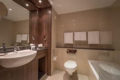 Agréable et confortable, c’est super ! Cette belle chambre a tout ce qu’il faut pour un séjour merveilleux. L’atmosphère est sereine et reposante. Elle accommode un grand lit ou des lits jumeaux et dispose d’un coin salon avec de beaux fauteuils. Salle de bain chic.