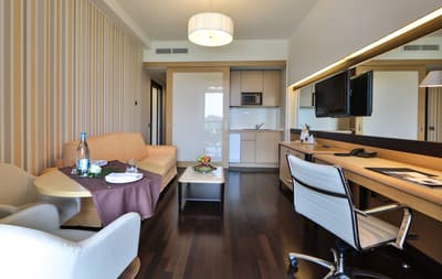 Spacieuse, elle bénéficie d'une belle luminosité et d’un balcon privé d'où vous pourrez vous relaxer et contempler la vue environnante en toute intimité. Pour les moments de détente, vous pouvez lire votre livre préféré ou prendre votre apéritif dans le confortable canapé-lit dans l’espace détente.