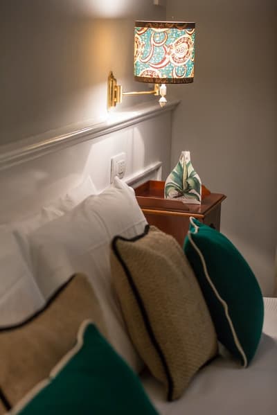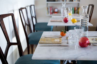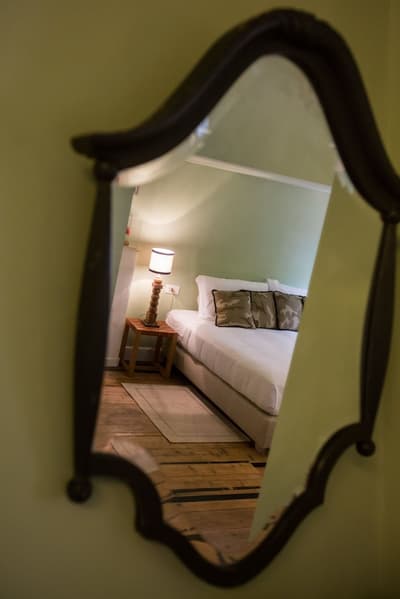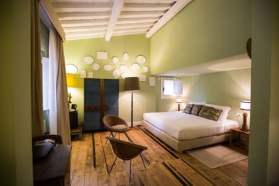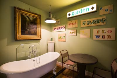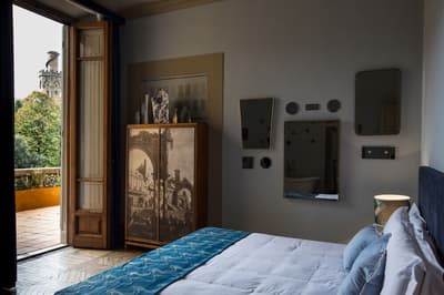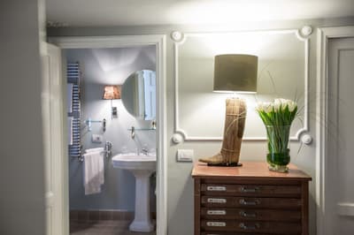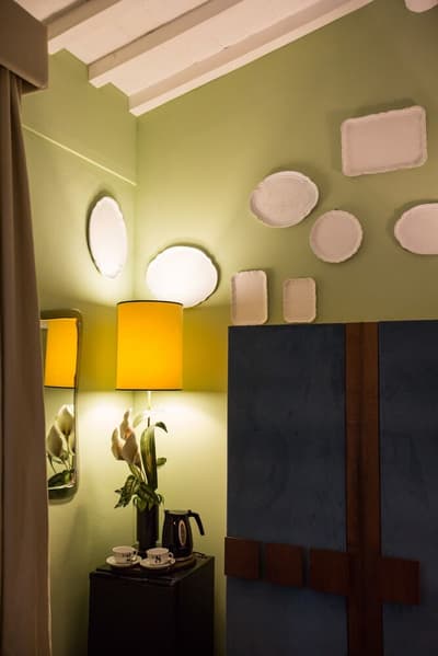C’est décidé, pour votre escapade vous avez jeté votre dévolu sur la rive gauche de Florence. Dans le quartier de l’Oltrano bien sûr, truffé d’ateliers d’artisanat et d’antiquaires. Et plus précisément dans ce palais XVIIIe qui trône au cœur du jardin Torrigliani, le plus grand parc privé d’Europe, excusez du peu. Arrêtez-vous devant ce portail noir de la rue Campuccio. Une loggia, un escalier de pierre habillé de rouge, il faut grimper jusqu’au 1er étage sous le regard de portraits anciens. Peut-être les ancêtres de la famille, toujours propriétaires du palais et qui occupe tout le rez-de-chaussée ? Pas de lobby mais une vaste pièce commune. Parquet patiné et lustre à pampilles, cheminée et fresques au plafond, un comptoir de bar très fifties, des tables de bistrot, une flopée de trophées, des fauteuils dépareillés : on sent les objets chinés, les œuvres designées. Les 14 chambres donnent sur la Via ou sur le parc, c’est selon, mais chacune a sa personnalité bien affirmée, truffée de meubles vintage, de souvenirs de voyage et d’objets d’art contemporains qui jouent les intrus amusants. Poussez l’une des hautes portes-fenêtres ; dehors, cette terrasse qui file, tout en longueur et déploie une vue superbe sur le jardin. Il vous nargue car vous ne pourrez l’arpenter qu’accompagné, c’est dommage. A défaut, s’il fait beau, vous le contemplerez, en prenant votre petit-déjeuner. Et le soir, en rentrant, c’est vous-même qui vous servirez un Campari en regardant le ciel d’été, pour essayer d’aller Adastra, jusqu’aux étoiles en français !