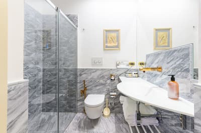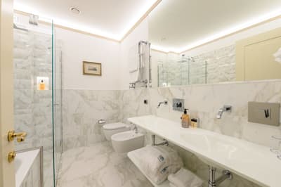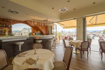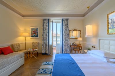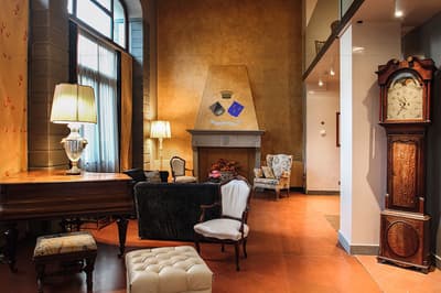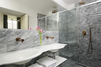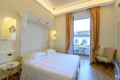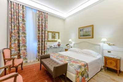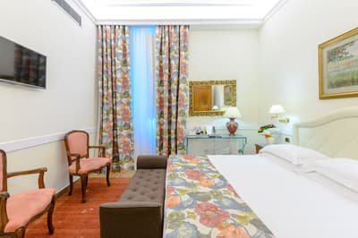 Ah cette vue sur les toits de Florence, elle est magique ! L’hôtel Kraft tient là un argument de poids. Son rooftop sur deux niveaux est immense, et au milieu trône… une formidable piscine ! Comme en plus elle est surélevée, vous aurez un panorama à 360° sur la ville et sur les collines qui l’entourent. Un paysage urbain et bucolique dans un même tableau ! Vous aurez envie d’y être tout le temps, et ça tombe bien puisque le bar et le resto ont la bonne idée de se trouver là. Il y a plein d’espaces différents où s’installer. Ici la zone des transats aux coussins rayés bleu et blanc, plus loin la terrasse au mobilier lounge, quel choix cornélien ! On a parfois l’impression d’être sur le ponton d’un bateau, parfois dans un jardin avec le cyprès, les pins et le mobilier en fer forgé. La pergola en paille avec ses rideaux beiges est charmante, vous ne trouvez pas ? Un refuge ombragé idéal à l’heure de la sieste, en tout cas ! Sinon, la déco intérieure de l’hôtel est une alliance de moderne et d’ancien. Vous allez retrouver du mobilier d’époque de style italien et français un peu partout, des salons aux chambres. Pas de surcharge, mais un équilibre bien pensé et du raffinement sous de beaux volumes !