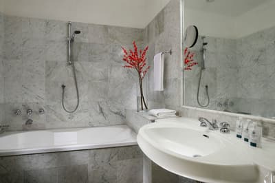 Plus spacieuse, elle a tout ce qu’il faut pour un séjour purement confortable. De ses grandes fenêtres, elle profite d’une vue reposante sur les jardins. L’atmosphère est sereine. Elle accommode un grand lit ou des lits jumeaux et dispose d’un beau fauteuil dans un coin de la pièce. Salle de bain chic.
