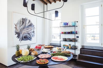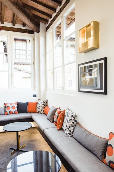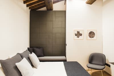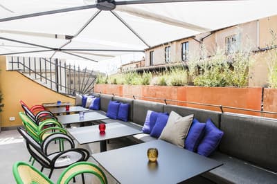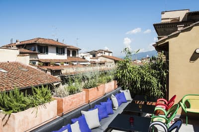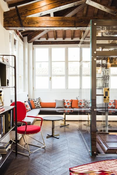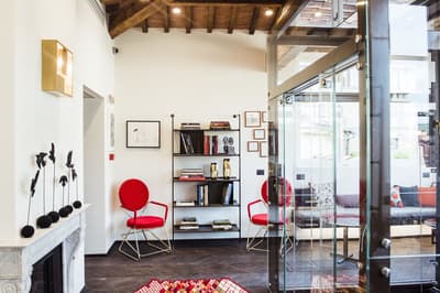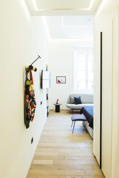 Vous voici en cœur de ville, dans la via de Tornabuaoni. Vous venez pour une virée shopping ? Vous êtes au bon endroit. Mais trêve de frivolité, même si le Milu Hotel est encadré par des boutiques haut de gamme, il décline aussi un joli pedigree. Car l’histoire du palais Altoviti Sangalletti remonte au XVe siècle et a été, au fil des siècles, la propriété de plusieurs familles de la bourgeoisie florentine. Remanié en 1835, il était fort côté : le rez-de-chaussée abrita en effet, jusqu’à la seconde guerre mondiale, le Gran Caffé Doney, où tout le gratin se devait de venir déguster une glace ou un chocolat chaud ! Vous entrez, et là, tous les codes changent : place à un design contemporain où les œuvres d’art conversent agréablement avec l’escalier de pierre XVIIIe. L’hôtel intègre en effet une galerie d’art qui s’étale sur les 5 étages. Toutes les pièces sont d’ailleurs en vente. De même, à chacune des 22 chambres son univers et sa palette de couleurs, ses éclairages et ses designers italiens tels Rimadesio ou Minotti, Magis ou Bonaldo e Gubi. Ici, le minimalisme tord le cou aux à-priori : parquet blond et teintes vives donnent même à croire que l’espace est plus vaste ! Le matin, direction la librairie ou la terrasse aux beaux jours : juste histoire de prendre un petit-déjeuner roboratif avant d’entamer la journée.