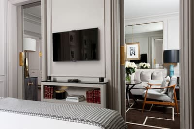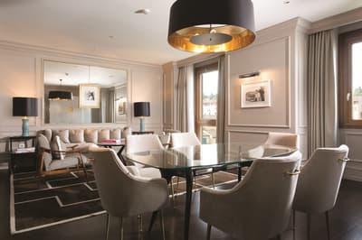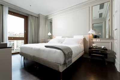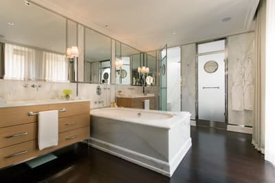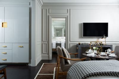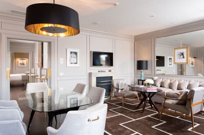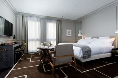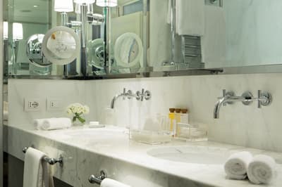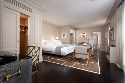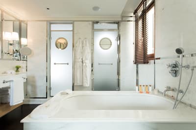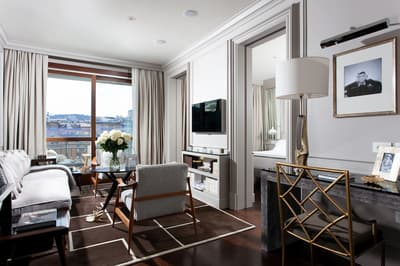 La suite intemporelle a tout ce qu’il faut pour un séjour merveilleux. Les grandes fenêtres profitent d’une belle vue sur la ville vibrante. Elle se prolonge pour procurer une sensation d’espace et d’ouverture. Elle accommode un grand lit et son coin salon est meublé de beaux fauteuils. Salle de bain avec baignoire et douche à effet de pluie.
