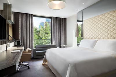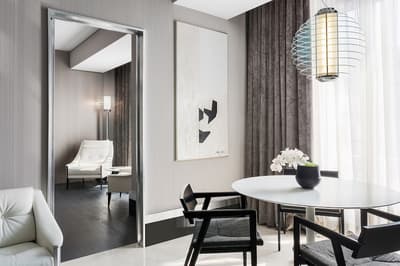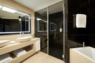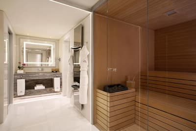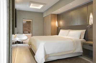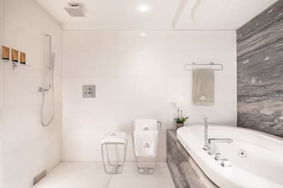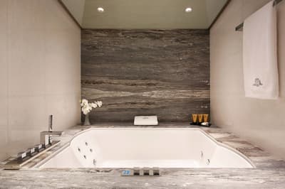Le top ! Agréable et d’une dimension généreuse, elle est idéale pour un séjour entre amoureux ou pour une petite famille. La grande baie vitrée offre une vue merveilleuse sur la végétation luxuriante et sur la ville. Cette belle suite baigne dans une atmosphère sereine et reposante. Elle accommode un grand lit et le coin salon est meublé d’un canapé et de beaux fauteuils. Salle de bain avec douche à effet de pluie.