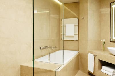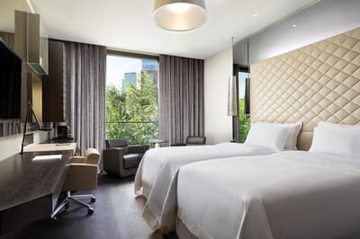 C’est encore plus d’espace. Très agréable, elle a tout le nécessaire pour un séjour merveilleux et reposant. La grande baie vitrée offre une vue merveilleuse sur la végétation luxuriante et sur la ville. Elle accommode des lits jumeaux et dispose de beaux fauteuils dans un coin de la pièce. Salle de bain avec douche à effet de pluie.